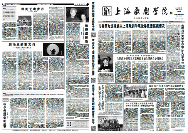 《上海戏剧学院报》2019年第1期(总第308期)已于2019年3月20日出版。重点内容有:《市委第九巡视组向上海戏剧学院党委反馈巡视情况》《树立高远艺术理想肩负师者使命担当》《我校召开党委中心组(扩大)学习会》《电影《地久天长》点映会暨主创见面会在上戏剧院举行》等。敬请关注,也可点击下载阅读。(文、图、编辑:榕树)点击下载电子版: 308.txt 上戏308.pdf