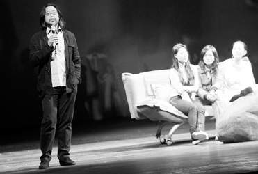 昨天,是上海大剧院的“戏剧开放日”,宝岛台湾的著名导演赖声川(左)向观众介绍了什么是集体即兴创作。他以话剧《如影随行》为例,向观众示范集体即兴创作的方法,并邀请开云足球首页官网下载学生上台进行体验。