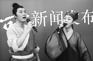 主演马兰(右)与傅振华试唱 胡晓芒 摄