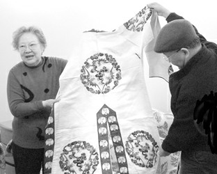李蔷华(左)展示俞振飞穿过的戏服。 徐超非摄