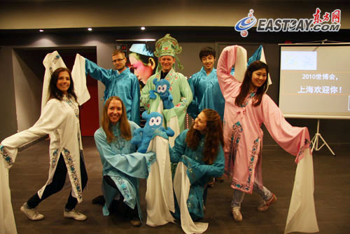在京剧双语工作室活动现场,外国留学生们学习了一些基本的“京剧身段”和“把子功”,穿上传统京剧服装的学员们有模有样的跟着上戏的专业老师学着各种动作,或者传神到位或者笑料百出。在学唱完一段经典的京剧唱段《女起解》(苏三起解)之后,平时连说普通话都不太利索的留学生们,迫不及待的在老师的带领下用京剧唱腔演唱起了“上海欢迎你”。还有的学员则拿着玩具海宝,开心的合影留念,在镜头前展示了自己最热情的“世博邀约”。