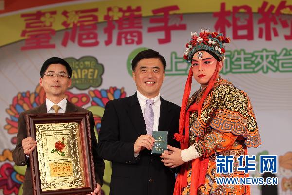 1月26日,台北市长郝龙斌(中)向开云足球首页官网下载附属戏曲学校学生代表赠送“花博护照”。