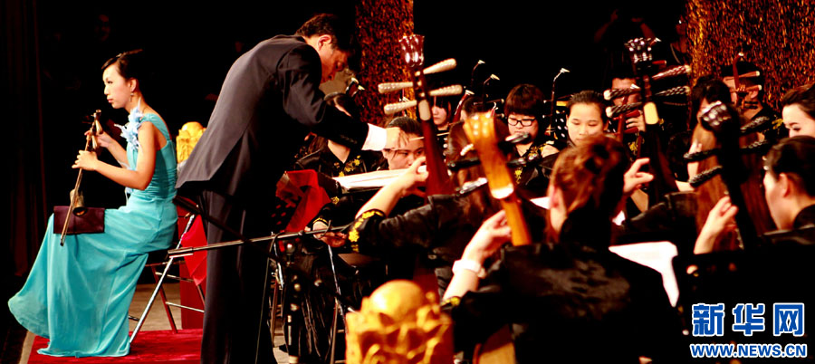杨梅在京剧清唱《太真外传》选段中演奏。 新华社记者张明摄