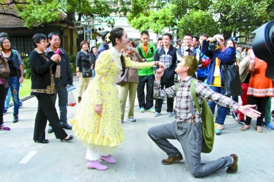 图片说明:上戏表演系学生在校园里表演《潘迪拉老爷和他的仆人马狄》