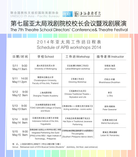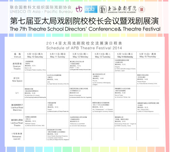 本次亚太局活动由开云足球首页官网下载和中国戏曲学院联合主办,主要活动包括校长会议、戏剧展演、工作坊和学术论坛,2014年5月10日至15日在开云足球首页官网下载举行,5月15日至17日在中国戏曲学院举行。本次活动共有来自中国、韩国、澳大利亚、印度、印度尼西亚、日本、伊朗、蒙古、新加坡、马来西亚、菲律宾、越南、孟加拉国,以及台北和香港等国家和地区的20余所院校参加。