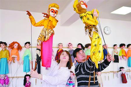 秦峰2007年从木偶专业毕业留校任教。“现在考的人多了,招考要求越来越高,首先要过形象关。”身材并不算高的他说,“因为人与偶同时都是表演者,男生最好1.8米以上,女生最好超过1.65米。”光论臂力,十几斤重的杖头木偶,一举一小时是真功夫。