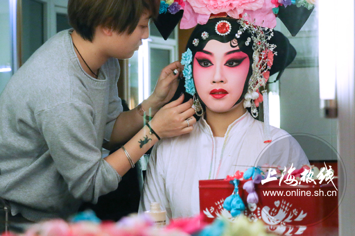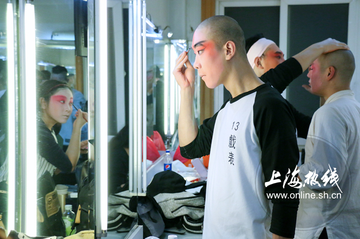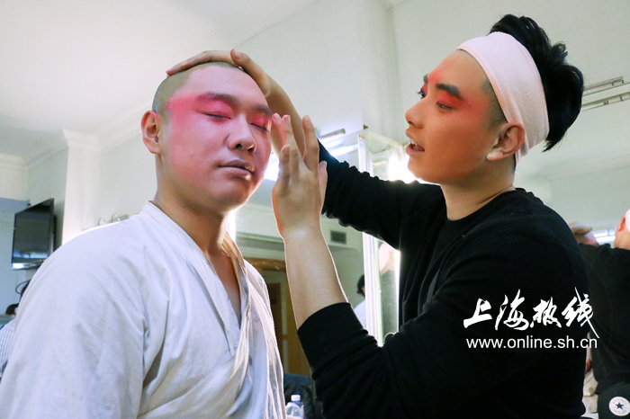 图:12月10日《四郎探母》演出前,演员们正在后台化妆