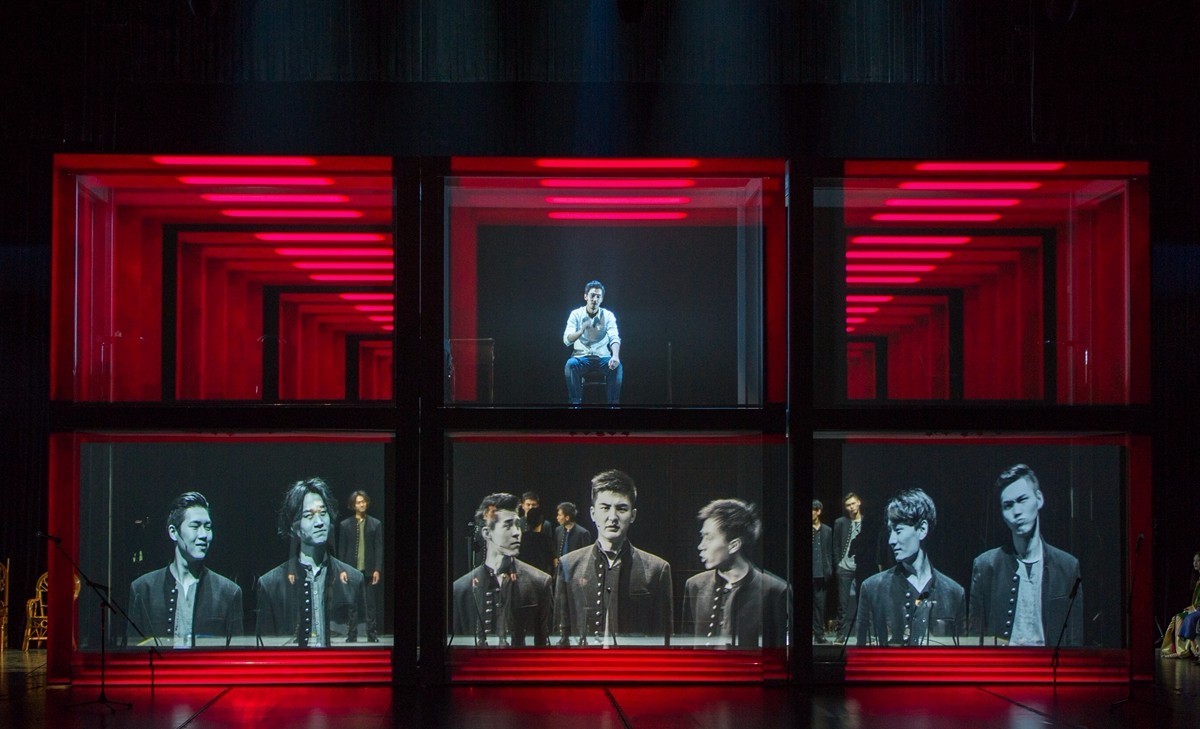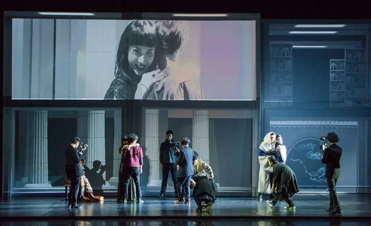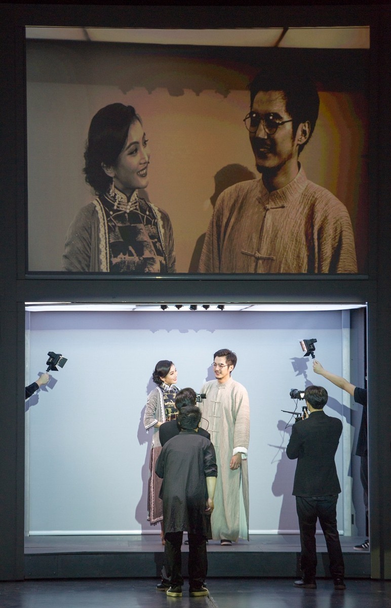 原版的舞台几乎是“空的空间”,可暗可亮的移动灯箱及屏风是主要道具,新版的舞台主体,是六个可移动的抽象空间组建的两层盒子,遮挡的纱幕可以“透视”人物关系,投射图文、视频等历史文献及实时影像,也会升起将空间让位于田汉与几位女性相处的时光,随时等待摄影机步上前来,将细枝末节向台下同步坦诚。近几年因英国知名女导演凯蒂•米歇尔的《朱莉小姐》而为国内戏剧人认知并频频使用,却屡屡乱了阵脚的“即时摄影”,在新版《狂飙》里以或舒缓或急遽的流畅拍摄与剪辑,真正做到与中国戏剧相得益彰的结合。台上逶迤而行的八台摄影机对舞美空间的切割与重组、情节张力的补充与连缀、表演情绪的放大与递进,恰到好处令人难忘。