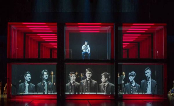 有时,6块幕布各自投射不同的演员的神态动作;有时,两块幕布同时亮起,同步播放两个人物对同一个人的回忆;有时,幕布成为一整块,投射出如历史课PPT般的资料印象;有时,幕布作为演出后景,实时剪辑播放一段黑白影像的戏剧表演……剧情因此而变得更为立体和深入,节奏也由之产生跳跃。