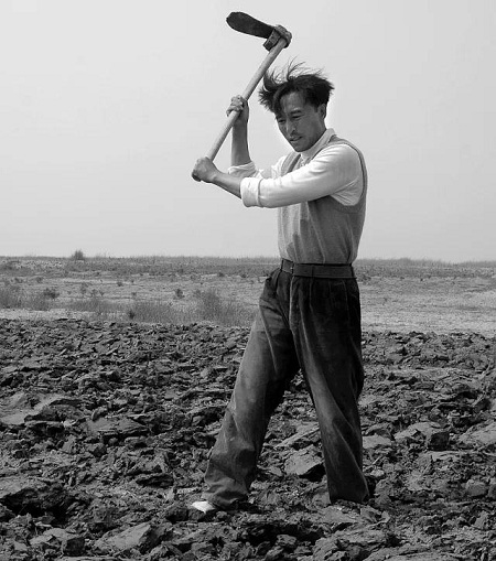 当时正好赶在小浪底水库放水,我站在沙丘上,小浪底的水还没来之前我就先陷进去了,因为水下面已经都渗进来了。陷进去了以后脚正面是拔不起来的,必须左右晃一下,因为一走就吸进去,我就得晃一晃,跳着这个怪舞蹈往前走。