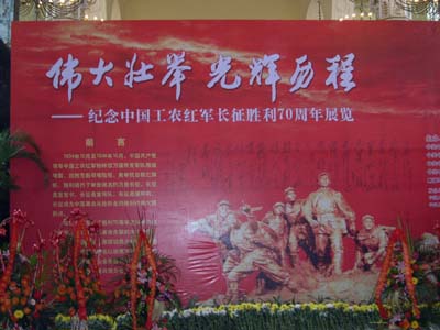 今天我们参观了为了纪念中国工农红军长征70周年而举行的规模宏大的展览,这是一次令人震撼的展览,对于新一代的青少年,我们对此了解的太少了,一副副画面让我们意识到战争远远比我们想的残酷,我们最可爱的人也远远比我们想的伟大,他们是铁铮铮的英雄,我们不仅应将他们那一张张脸铭刻于心,更应传承,传承他们那种不朽的精神。在博物馆精心的布局下,我们随着长征的时间发展又重走了一边长征路,佩服,感动,激励,这是一次心灵的洗礼,一次灵魂的撞击,一次极其伟大的壮举,“伟大“也许此刻我才能真正体会到它意味着什么。同学们在参观的过程中都是表情凝重,也许此时他们才真正体会到了一种历史的重担吧。一步步中我们看到一个个故事,一个个幸福感人的却又混着血与泪的故事,这是怎样一种震撼我无法形容,但我知道两万五千里,爬雪山,过草地,千难万险,这是怎样一种精神在支撑。在展厅中我们看到这样一首《牛皮腰带歌》,“牛皮腰带三尺长,草地荒原好干粮。开水煮来别有味,野火烧熟分外香。一段用来煮野菜,一段用来熬鲜汤。有汤有菜花样多,留下一段战友尝。”是乐观还是辛酸,心情难言,我们这些最可爱的人在面对当时那一种恶劣的境域时是乐观的,而我们身处幸福年代,通过一张张图片来想象从前,我们不禁心酸。两万五千里,代表的并不仅仅是一个数字,它是一路漫长的征程。