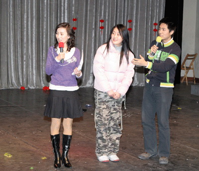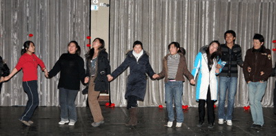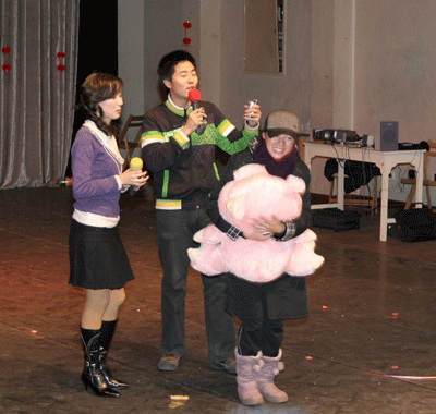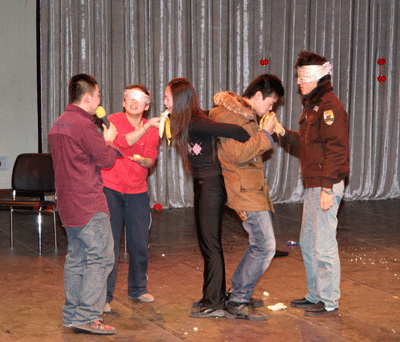 为了使舞会更具有新年的浓郁氛围,舞会开始时在整个剧场周围挂满了一个一个的小灯笼,灯笼下面挂着各色各样的灯谜,先到的同学可以在那里打打灯谜,作作游戏,猜中的同学还可以领到一份意外的奖品。而之后,打扮成小丑的李子南扛着同样的打扮成小丑的甘源来到了舞台上,他们在台上唱歌跳舞,幽默的表演引来了大家一阵阵的欢笑。然后,主持人李炯定和夏青正式宣布元旦舞会开始,之后立刻进入了游戏环节,解扣、蒙眼吃香蕉、猜数字、电影配音等等花样百出的游戏,再加上游戏主持人夏帅在一旁的引导和风趣评论,使得无论参与者还是观众,都享受到了其中的乐趣。而游戏中间还穿插着抽奖,谁能最快打进主持人的电话便有一次抽奖的机会,但有的在抽奖的同时还要当场表演各种即兴的节目,更增添了抽奖活动的娱乐性。而最后的“DJ炫舞”使得舞会达到了一个高潮,所有人手拉着手在舞台上围成了一个圆圈,然后一个接一个的在圈子里秀出自己最炫的舞姿,跳出自己最酷的动作,在这个有点寒冷的冬夜,留下了一个个最火热的回忆。