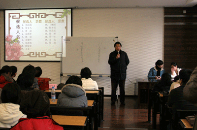 12月29日12:00戏文系首届团总支及系部学生会竞选大会在红楼209教室顺利召开。戏文系共计71名同学参加了此次选举大会。会上,18位候选人分别进行了真挚而又热情洋溢的二分钟竞选演讲,充分展示了同学们竞选的激情。整个过程中,与会的各位同学情绪高涨,现场气氛异常热烈,竞选演说完毕后,与会的同学们认真地投出了代表自己意向的一票,选出自己心目中的团总支及学生会委员。