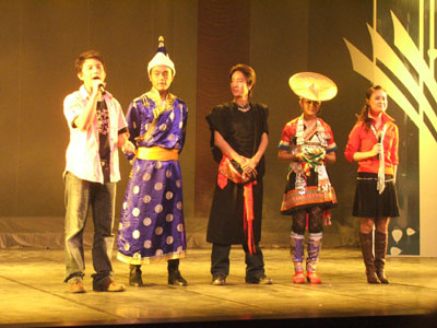 06表演系影视班达斡尔族小伙子索牧一首悠扬浑厚的蒙语独唱《蒙古人》还在余音绕梁,同班的徐凡就以一支活泼灵动、优美无比的傣家《帕织秧》舞蹈而博得满堂喝彩,04级表演系藏班阿旺仁青等5位豪迈的藏族小伙深情大气的民歌《心爱的姑娘》更是把现场气氛推向高潮。表演结束后,同为少数民族同胞的主持人百克力还别出心裁地请回几位用自己的民族语言向祖国母亲的寿辰问候,不仅让人再次感叹,上戏真是个民族团结的大家园。