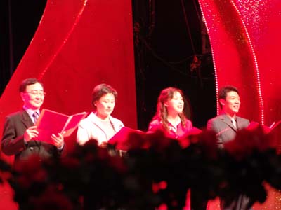 院本部宋怀强老师的《领袖风采》表演,生动再现了国家几代领导人的亲切话语,将全场气氛推向高潮,欢快而热烈。在院本部和分院联袂演唱的《祖国,我为你干杯》和独唱《西班牙女郎》之后,晚会在雄壮热情的大合唱《歌唱祖国》声中落下了帷幕。