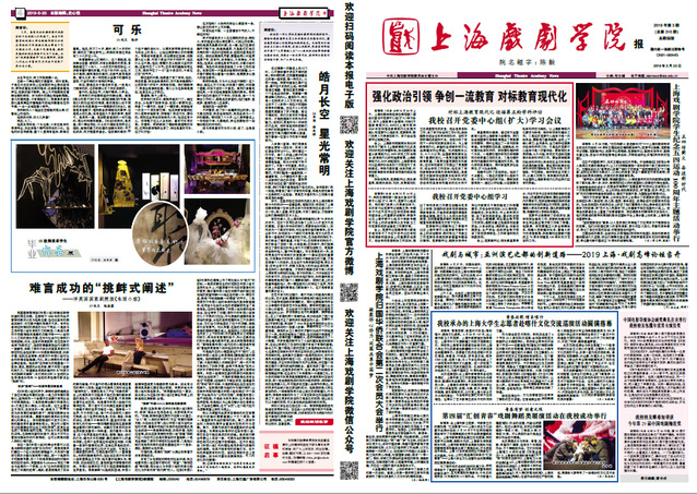 《上海戏剧学院报》2019年第3期(总第310期)已于2019年5月20日出版。重点内容有:《强化政治引领 争创一流教育 对标教育现代化》《上海戏剧学院学生纪念五四运动100周年主题活动举行》《我校召开党委中心组学习》等。敬请关注,也可点击下载阅读。(文、图、编辑:榕树)