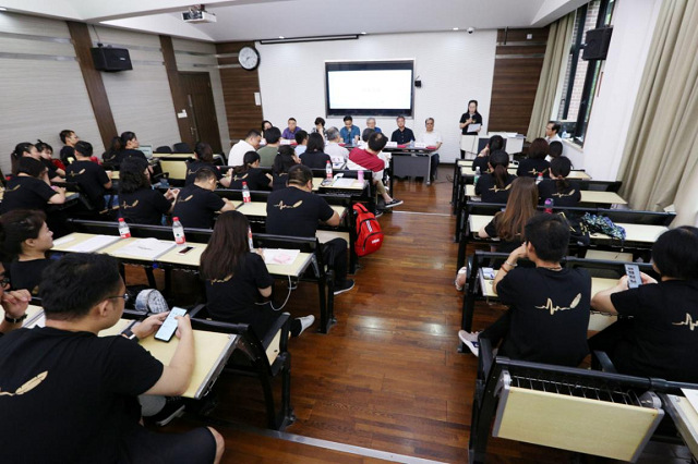 ,上戏红楼209,这间教室记录着学员们埋头写作的身影,老师们点评作业的声音,专家们坐而论道的场景。此时窗外雷声阵阵,大雨滂沱,教室内充满了离别的伤感,于是发生了本文开头的一幕。学员们穿着印有编剧工作坊logo的T恤,前来为他们送别的人们有:上海市教委副主任倪闽景,上海市教育学会秘书长苏忱,上海市教委体卫艺科处处长陈华,上海戏剧学院党委副书记胡敏,上海戏剧学院党委副书记、副院长张伟令,上海戏剧学院副院长刘庆,上海戏剧学院学术委员会主任叶长海,上海戏剧学院创作中心主任赵韫颖,上海戏剧学院戏文系主任陈军。众多大咖云集于此,足以见得各级领导和各位专家对编剧工作坊及学员们的高度重视。