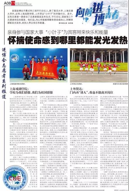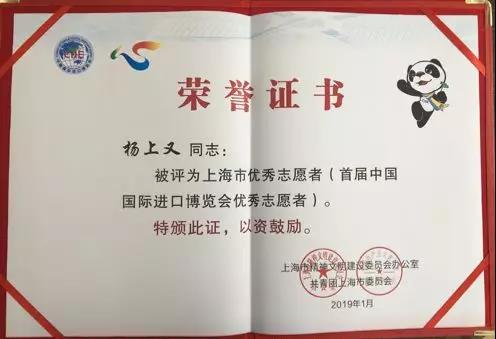 我校16级戏剧影视表演专业杨上又同学作为上戏进博会志愿者团队的带队组长,以高度的责任心和优秀的服务工作荣获“上海市优秀志愿者”称号。