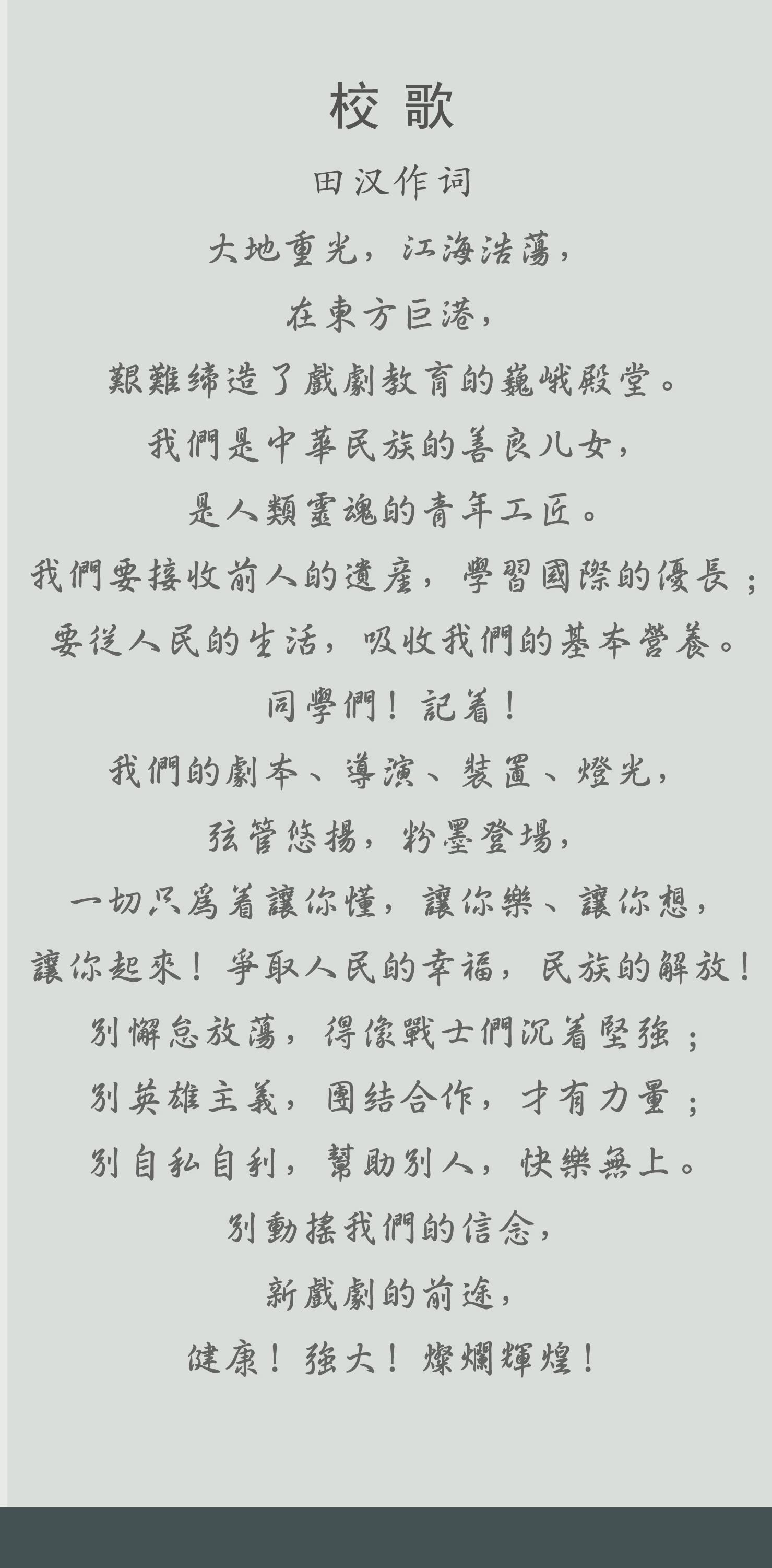 承载着校训精神的校歌由田汉于1947年所作,饱含了作者对戏剧崭新未来的希望,为戏剧教育指明方向。1946年即将上任校长的熊佛西先生和田汉先生相约在北四川路凯福饭店,席间熊佛西对田汉说:“为剧校写一个校歌吧。”田汉沉吟了片刻,便爽快地答应了。很快田汉写的校歌歌词送到了学校。