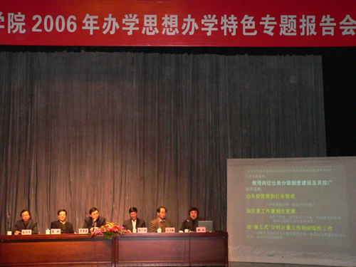 为了在广大教职员工中富有成效地开展关于办学思想和办学特色的讨论,我院在邀请校外教育专家作了第一场专题辅导报告之后,于4月6日,又在小剧场举办了第二场专题报告会。院党政领导班子成员贺寿昌、荣广润、葛朗、张仲年、刘志钢、韩生等同志在主席台就座,全院教职工出席大会。会上,院长及各副院长围绕各自主管工作作辅导报告。报告会由院党委书记贺寿昌同志主持。