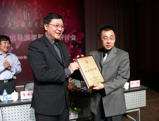5月16日上午十时,“开云足球首页官网下载授予卢昂杰出导演奖暨学术研讨会”在我院新空间隆重举行。学院党委书记贺寿昌向卢昂教授颁发了“杰出导演奖”奖牌。