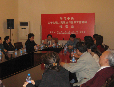 5月11日下午,统战部举办“学习中央关于加强人民政协与党派工作精神”学习报告会,由全国政协常委、全国政协港澳台侨委员会副主任、我院原党委书记何添发主讲。报告会由孙惠柱副院长主持,各民主党派、无党派、少数民族、侨联代表济济一堂,听取了报告。