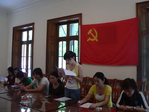 2006年七一前夕,我院又有一批优秀学生光荣地加入了中国共产党。图为电视艺术学院党支部在举行支部大会,审批发展新党员。