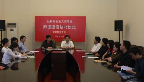 为弘扬社会主义荣辱观,加强师德和职业道德建设,规范新教工的业务水平,充分发挥老教工的传、帮、带作用,工会、宣传部、人事处于日前共同主办“新老教职工结对子”活动。活动中,各院、系、部门的新老教职工将签署《结对协议书》,《协议书》要求新老教职工们在思想上相互关心,在工作上相互帮助,在生活上相互照顾,共同努力,携手奋进,为学院新一轮的发展做出更大贡献。