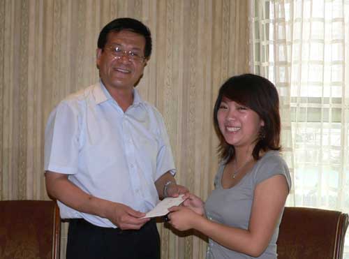 2006年7月17日中午,我院为今年参与西部服务计划的志愿者――02服化专业的戴雯静同学举行了出征前的饯行仪式。院党委副书记、副院长葛朗老师,舞美系主任刘永华老师,党办副主任黄桂英老师,团委书记徐咏老师和戴雯静的班主任潘建华老师等共同出席。此次,戴雯静同学将作为全国服务西部计划志愿者赴云南省保山市腾冲县和川乡宣传文化站开展为期一年的农村文化建设工作,葛朗老师对戴雯静同学的高尚行为给予了高度评价,也对其提出了殷切的希望。