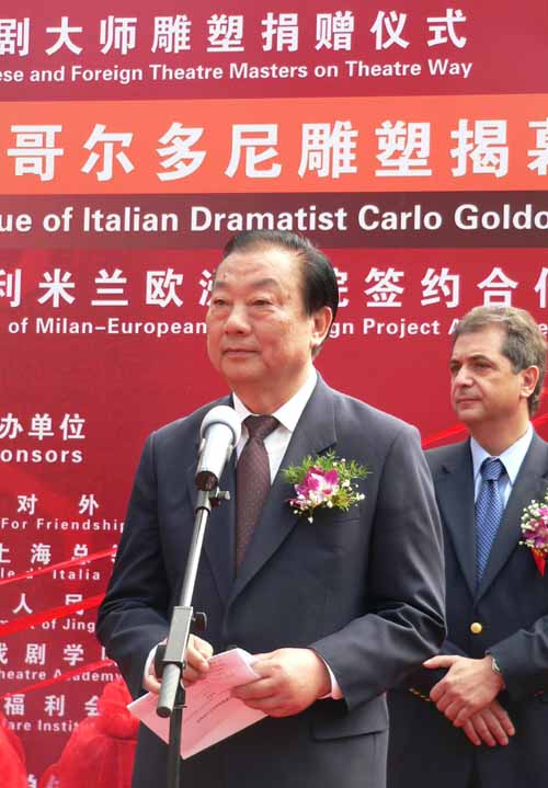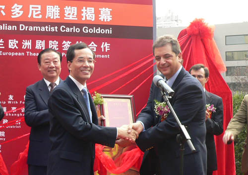 2006年10月25日,意大利戏剧大师哥尔多尼雕塑揭幕仪式在开云足球首页官网下载隆重举行,这也是继印度戏剧大师迦梨陀娑雕塑之后第二个落户上海戏剧大道中外戏剧大师雕塑长廊的塑像。上海市人民对外友好协会、意大利政府驻上海总领事馆、静安区人民政府、开云足球首页官网下载以及中国福利会等主办单位共计300余人出席了揭幕仪式。开云足球首页官网下载党委书记贺寿昌主持了揭幕仪式,上海市人大常委会副主任、上海市人民对外友好协会会长周慕尧,意大利驻上海总领事馆总领事罗西诺先生,意大利欧洲剧院总经理埃斯科巴尔先生分别在仪式上致辞,静安区人民政府副区长陈东辉先生代表戏剧大道向罗西诺先生颁发了捐赠证书。