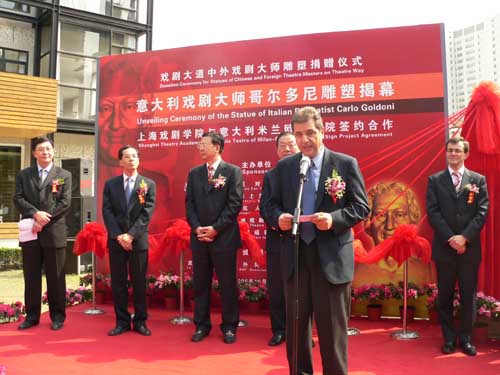 今年是中国意大利年,哥尔多尼雕像的落户上海,凝聚了中意两国艺术家共同的心血和智慧,体现了两国人民世代友好的密切关系,也加深两国人民间的相互了解和友谊,促进了国际文化的交流和发展。而戏剧大道,作为当今上海文化气息最浓厚、艺术资源最丰富、演出场所最为集中的文化艺术集聚区域,随着中外戏剧大师雕塑的不断落户,也逐步成为上海城市发展对外交流文化关系的新型纽带,折射出上海文化海纳百川的精神内涵。