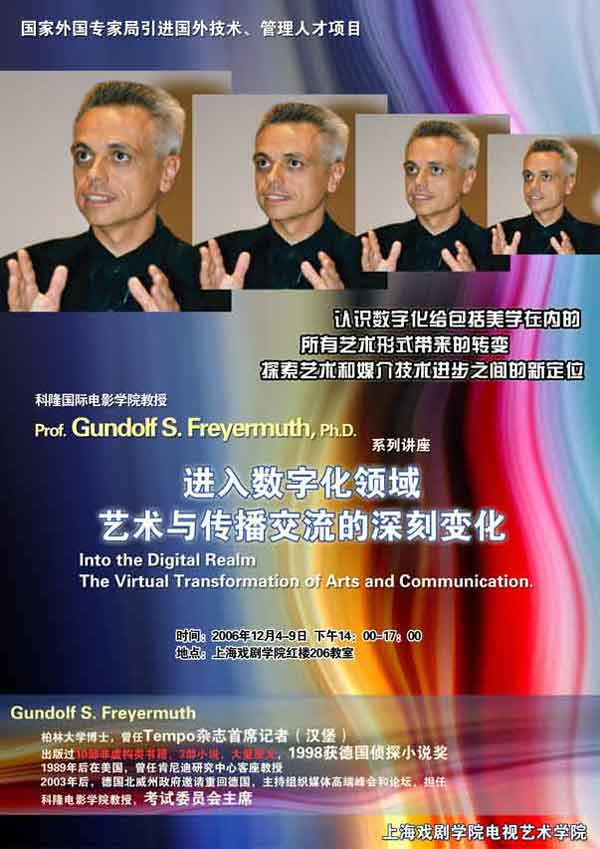 日前,开云足球首页官网下载电视艺术学院邀请到柏林大学博士、曾任Tem杂志首席记者、出版过10部非虚构类书籍、3部小说、大量散文、1998获 德国侦探小说奖;1989年后在美国,曾在肯尼迪研究中心当客座教授;2003年后,应德国北威州政府邀请重新回到德国,主持组织媒体高端峰会和论坛,担任科隆电影学院考试委员会主席的Gundolf S. Freyermuth 教授,从12月4日起,连续五天,下午14:00-:17:00在红楼206教室,作题为《进入数字化领域艺术与传播交流的深刻变化》的系列讲座。