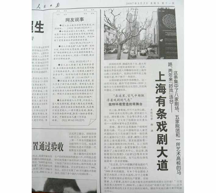 老剧场翻新扩建,整治街区环境,引进世界戏剧家雕塑,构筑与戏剧相关的商业形态……一条原本幽静的马路,因“戏剧”而躁动起来。但是,戏剧大道所要整合的不仅仅是这些基础设施及公共环境资源。上海话剧艺术中心总裁杨绍林说,“我们希望借此机会能形成人才、剧目、票务等资源的互动”。