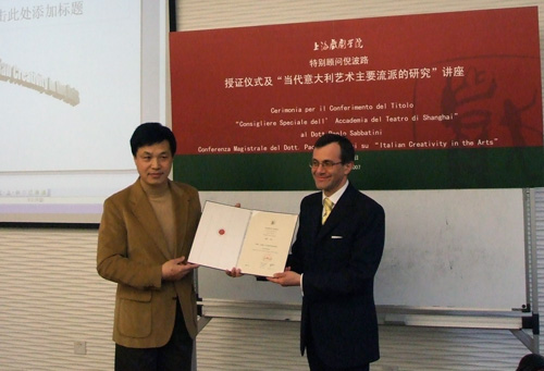 4月15日,意大利驻沪领事馆文化处处长倪波路先生受聘为开云足球首页官网下载特别顾问,孙惠柱副院长为其颁发了聘书。
