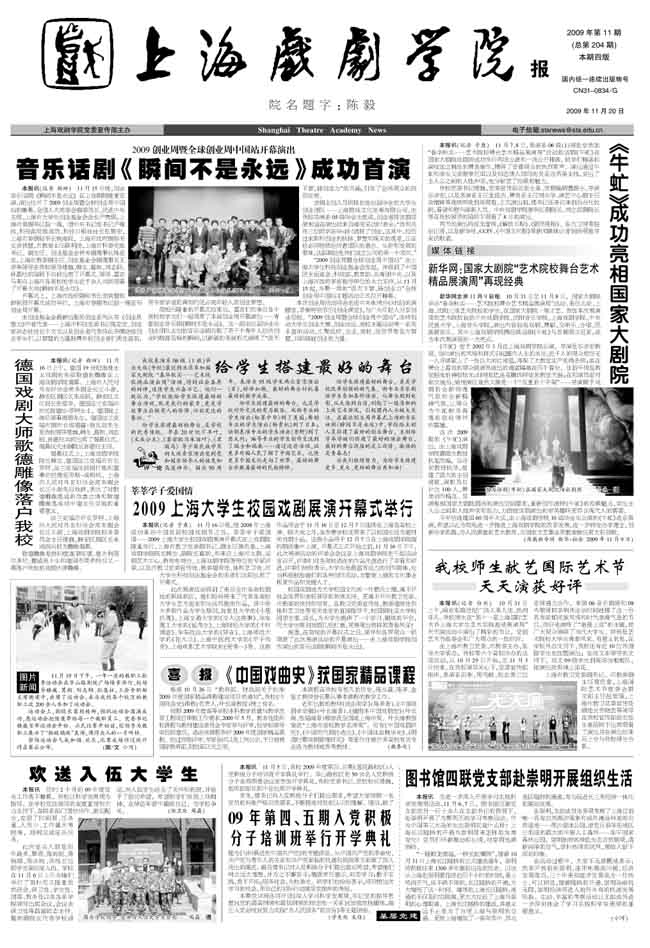 《上海戏剧学院报》2009年第11期已于2009年11月20日出版(总第204期),本期四版,本期重点内容有:《音乐话剧《瞬间不是永远》成功首演》、《<牛虻>成功亮相国家大剧院》、《德国戏剧大师歌德雕像落户我校》、《给学生搭建最好的舞台》、《莘莘学子爱国情2009上海大学生校园戏剧展演开幕式举行》、《<中国戏曲史>获国家精品课程》等,敬请关注。也可关注校园网主页新闻中心内院报专栏点击下载观看。也可点击附件下载观看。(图文/小河 编辑/雨田)