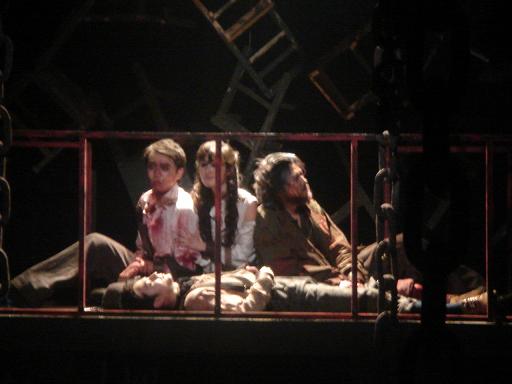 根据有关演出合同,我校表演系03级学生的毕业公演剧目《死无葬身之地》继06年底在学校成功上演之后,从5月4日至6日三天时间内,该剧组将在这里公演三场。在今晚的演出中,导演何雁老师根据首次公演的情况和专家的意见,对该剧演出样式进行了必要的调整和提高,加强了人物内心的冲突和故事结构的完整性。为了演出的成功、为了对学校四年学习的最好总结、也为了向上海市民汇报学习成果,我校03级的学生积极投入排练,以最昂扬的姿态迎接观众的检验。