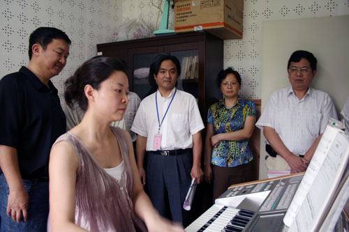 检查组考察音乐剧表演教学工作室,我校青年教师高瑜在演奏双排键