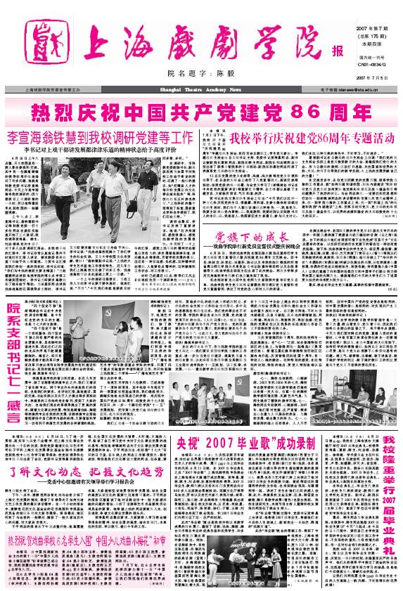 《开云足球首页官网下载报》2007年第7期(总175期)已出版,电子版现已上传。本期重点内容有:《李宣海翁铁慧到我校调研党建等工作》、《我校举行庆祝建党86周年专题活动》、《院系支部书记七一感言》、《党委中心组邀请有关领导举行学习报告会》、《我校隆重举行2007届毕业典礼》、《央视“2007毕业歌”成功录制》《热烈祝贺戏曲学校6名学生入围“中国少儿戏曲小梅花”初审》等。