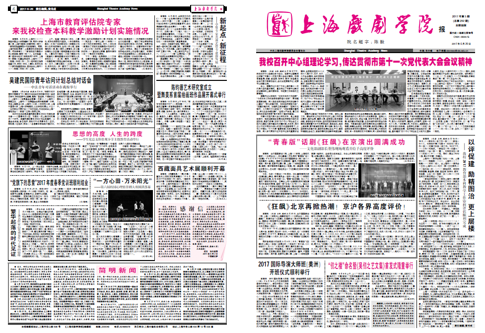 《上海戏剧学院报》2017年第5期(总第292期)已于2017年6月20日出版,本期套红,共四版。重点内容有:《我校召开中心组理论学习,传达贯彻市第十一次党代表大会会议精神》、《“青春版”话剧《狂飙》在京演出圆满成功——文化部副部长董伟现场观看并给予高度评价》、《<狂飙>北京再掀热潮!京沪各界高度评价!》、《2017国际导演大师班(美洲)开班仪式顺利举行》等。敬请关注,也可点击下载阅读。(文、图、编辑:榕树)