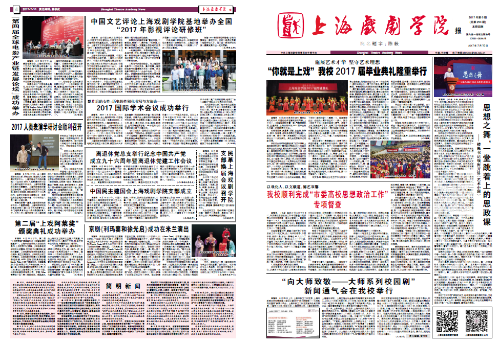 《上海戏剧学院报》2017年第6期(总第293期)已于2017年7月10日出版,本期彩版,共四版。重点内容有:《施展艺术才华 坚守艺术理想 “你就是上戏” 我校2017届毕业典礼隆重举行》《以戏化人,以文载道,德艺双馨 我校顺利完成“市委高校思想政治工作”专项督查》《思想之舞,一堂跳着上的思政课——楼巍书记领衔开讲<艺术中国>》《“向大师致敬——大师系列校园剧”新闻通气会在我校举行》等。敬请关注,也可点击下载阅读。(文、图、编辑:榕树)