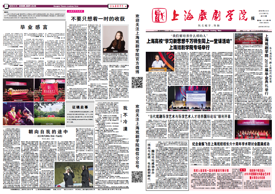 《上海戏剧学院报》2018年第6期(总第302期)已于2018年6月25日出版,本期彩版,共四版。重点内容有:《“我们要培养什么样的人” 上海高校“学习新思想千万师生同上一堂课活动”上海戏剧学院专场举行》《从上戏出发,踏上新时代的征途 上海戏剧学院2018届毕业典礼举行》《“当代戏剧导演艺术与导演艺术人才培养国际论坛”顺利开幕》《“挑战与机遇:电影的新时代”国际论坛成功举办》等。敬请关注,也可点击下载阅读。(文、图、编辑:榕树)