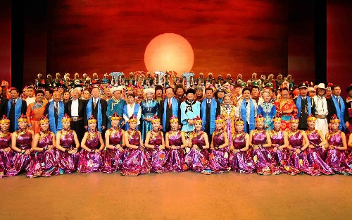8月9日晚,庆祝内蒙古自治区成立60周年文艺晚会《草原上升起不落的太阳》在内蒙古乌兰恰特隆重举行。中央代表团团长曾庆红和内蒙古自治区各族各界群众1300多人一起观看了演出。 晚会在动人的管弦乐曲《草原上升起不落的太阳》声中拉开帷幕。一个个精彩的节目、一曲曲动人的歌声,唱出了各族群众在党中央的领导下开创更加美好生活的共同心愿。精彩的表演几十次赢得现场观众的热烈掌声。演出结束时,曾庆红等中央代表团领导同志和内蒙古自治区主要负责同志走上舞台,向演职人员祝贺演出成功。