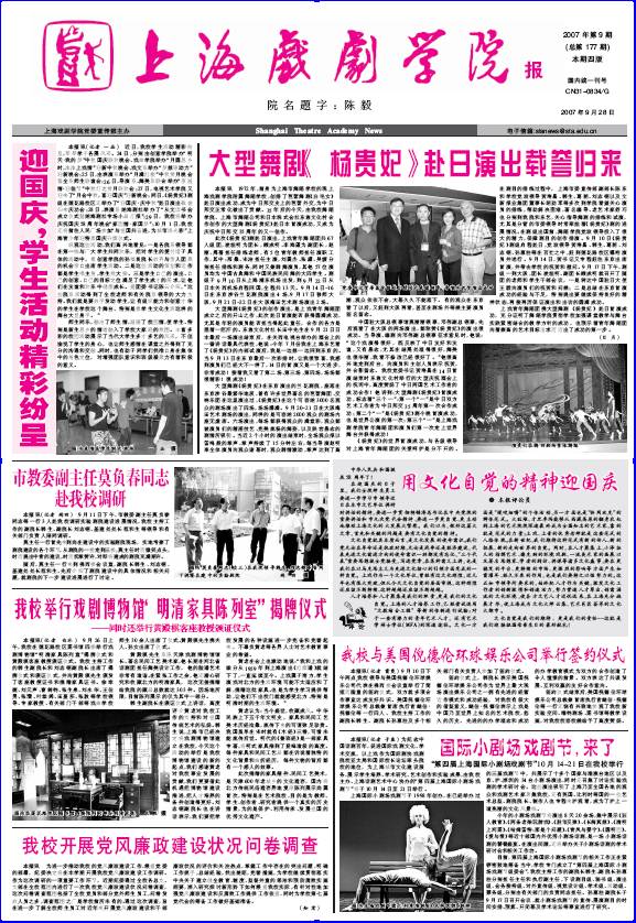 《开云足球首页官网下载报》2007年第9期(总177期)已出版,电子版现已上传。本期重点内容有:《迎国庆,学生活动精彩纷呈》、《大型舞剧《杨贵妃》赴日演出载誉归来》、《市教委副主任莫负春同志赴我校调研》、《“我校举行戏剧博物馆“明清家具陈列室”揭牌仪式》、《我校开展党风廉政建设状况问卷调查》、《用文化自觉的精神迎国庆》、《我校与美国倪德伦环球娱乐公司举行签约仪式》等。