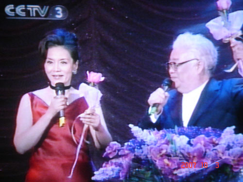 图为潘虹作为嘉宾与于洋一起主持电影颁奖活动(生泉摄于电视画面)