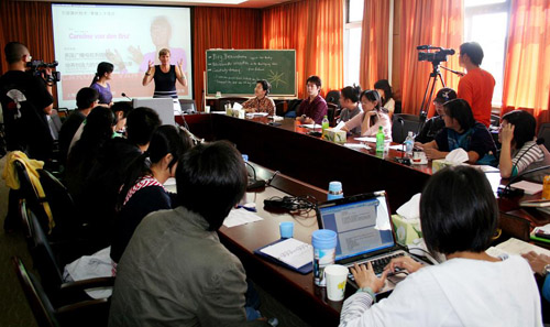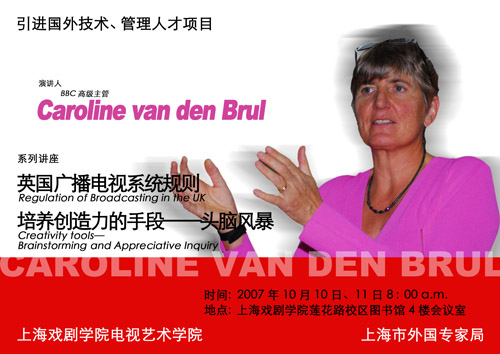 Caroline女士是英国广播公司高级主管、文化节目创意领导、2次获得英国电视学院奖提名、并且曾被英国女王授予英帝国员佐勋章。作为设计“头脑风暴”培训的高级领导人,她通过在课堂上和同学们做的小小游戏,向大家展示了BBC在制作节目时的群策群力,这些走在国内广播电视节目前沿的理论和实践,有助于增强提高学生们的知识结构。