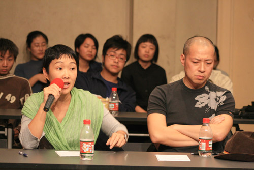 图为《两条老柴玩游戏》导演/编剧/演员之一甄文蓓在会上发言