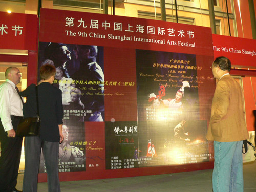 夜幕降临下的艺术节海报熠熠生辉,吸引了不少中外观众驻足观看