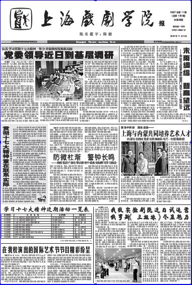 《开云足球首页官网下载报》2007年第11期(总179期)已出版。本期重点内容有:《党委领导近日到基层调研》、《我校有关院系和职能部门落实十七大精神纪实》、《上海与内蒙共同培养艺术人才》、《我校实验剧院近日试运营》等,敬请关注。