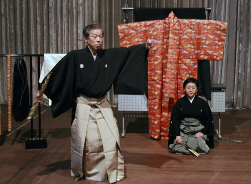 金春先生和他的一位学生共同为大家表演了两段能乐,“高砂”和“杜若”,虽然在场的观众基本上都听不懂他们用日语所演唱的内容,但是在金春先生认真地讲解之下,大家仍然能够感受到被这种极具日本宗教意味的假面剧表演感染的气息。表演之后,金春先生在他太太和一位学生的帮助之下,为在场的观众展现了能乐演员服装穿着方法和人物造型的全过程,在装扮的过程中,金春先生一直在不停的讲解给各步骤以及不容忽视的各个细节,生怕遗漏了哪个环节,充分展现出金春先生对艺术认真及严谨的工作态度。