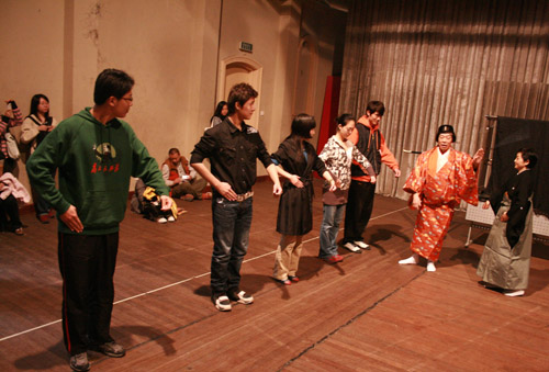 最后,金春先生请了现场的五位同学上场,亲身体验能乐演员的表演态势,让同学们用形体动作去感受作为一名能乐演员所特有的节奏和肢体语言。虽然,2个小时实在不足以让大家去完全了解一个民族所特有艺术文化,但相信他仍给在场的每一位观众留下了深刻的印象,让我们有了一次真实视界里的触碰。